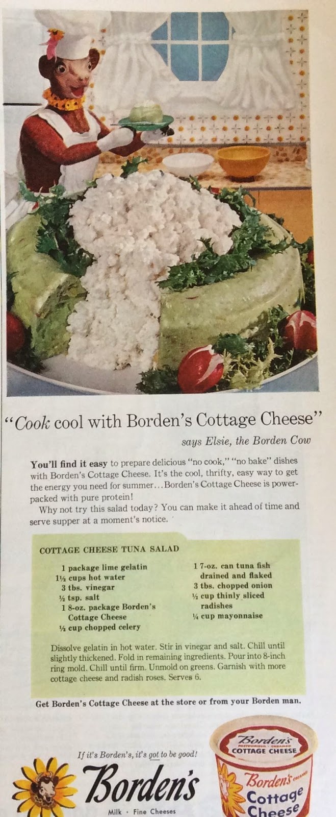 In case you can't read the recipe, the ingredients include: lime gelatin (gelatin, not Jello!), tuna fish, cottage cheese, celery, onion, radishes and mayonnaise. Now where did I put my jello molds!